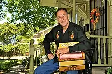 His father, Santiago "Flaco" Jiménez Sr. was a pioneer of conjunto music and pioneered the use of stringed bass (tololoche) in his work.[1] His older brother Leonardo "Flaco" Jiménez[3] is considered by many the greatest and most famous Tejano accordionist ever.[4] Santiago recorded his first album with his brother Flaco at age 17.[5] Unlike Flaco, who is noted for mixing his music with many styles outside the Tejano mainstream, Santiago has emulated his father and stuck with the formulas of accordion, guitar, and vocals.[1][6]