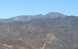 Santiago Peak is the southern mountain of the Saddleback landform in Orange County, California. It is the highest and most prominent peak of both the Santa Ana Mountains and Orange County, and also marks a border point with Riverside County. The peak is named for Santiago Creek, which begins on its southwestern slope.[1] During wintertime, snow does fall on the peak. A telecommunication antenna farm with microwave antennas sits atop the peak.