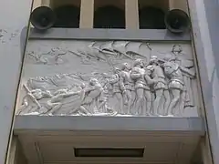 The church façade has receding planes with leaves designed in corbel arches. Over the triple portals of the church is a high-relief frieze depicting the story of La Naval de Manila. The giant bas-relief of Santo Domingo was designed by the Italian sculptor and expatriate Francesco Monti.[3][4]