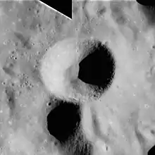 Santos-Dumont is a small lunar impact crater that lies in the northern end of the Montes Apenninus range at the eastern edge of the Mare Imbrium. It is located about 30 kilometers to the northeast of Mons Hadley, a mountain massif.