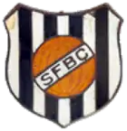 Since the club's foundation, Santos have had eight main crests, though all underwent minor variations.[29] In 1912, Santos adopted a black and white striped shield, with one of the early leather footballs in the middle and a diagonal band with the letters "SFBC".[30] In order to pay homage to Concórdia Club (who let Santos use their headquarters to plan its foundation), the club used a crest that incorporated three golden lemon letters, the letters S, F and C, in the center of an azure blue circle.[30] At the end of 1912, the crest was remade with a white band around the circle.[30] The white band was surrounded by a golden lemon border.[30] The letters were colored white with golden lemon serving as its outside borders.[30] Due to the difficulty of creating these colors consistently, the crest was rebranded to a white badge with black borders and the letters 'SFC' colored black.[30]