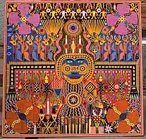 Pensamiento y alma huichol was created in 1997 for Palais Royal-Musée du Louvre station as part of the RATP - Mexico City Metro alliance. This is his most renowned and talked about work, which represents huichol deities, ancestors, myths, flora and fauna on a horizontal tripctic of the underground, the earth and the sky. The work is composed by 80 boards and elaborated with two million beads of 2 millimeters each one. It is located at the Palais-Royal Musée du Louvre towards the Carrousel du Louvre. On this work, researcher Miguel Gleason comments on his book México insólito en Europa: “Its perhaps the most impressive and detailed work in Europe, composed by more of 2 million beads that shows the cosmogony of that community (huichol people)”.[3]