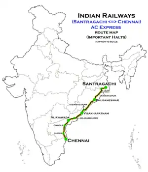 The 22807 / 08 Santragachi–Chennai Central AC Express runs from Santragachi Junction via Kharagpur Junction, Cuttack Junction, Bhubaneswar, Khurda Road Jn, Visakhapatnam, Vijayawada Junction, Gudur Junction to Chennai Central .