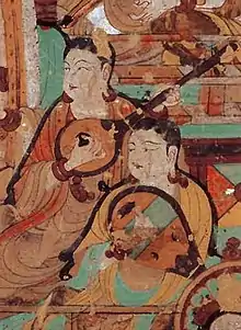 It has been suggested that sanxian, a form of spike lute, may have its origin in the Middle East, and older forms of spike lute were also found in ancient Egypt.[1] Similar instruments may have been present in China as early as the Qin dynasty as qin pipa (pipa was used as a generic term in ancient China for many other forms of plucked chordophones) or xiantao (弦鼗),[1][2] which the Qinqin and Ruan also come from. Some thought that the instrument may have been re-introduced into China together with other instruments such as huqin by the Mongols during the Yuan dynasty (1271–1368),[1][3] however, an image of a sanxian-like instrument was found in a stone sculpture dating from the Southern Song period (1217–79). The first record of the name "sanxian" may be found in a Ming dynasty text.[4][3]