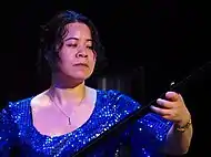 Traditionally, the instrument is plucked with one's fingernails—as is the case in the south of China—or with two hard and thin plectrums made from animal horn that are tied to the thumb and index finger; however, today players also use plastic pipa plectrums on all five fingers of the right hand.[7] The usage of fingernails, or pipa plectrums, allows pipa techniques—such as the tremolo—to be applied to the sanxian, as well as the performance of works traditionally written for the pipa. Other techniques for sanxian include the use of harmonics and hitting the skin of the instrument with the plectra or fingernail (comparable to the technique used to play the northern Japanese tsugaru-jamisen). In contemporary times, sanxian players popularly use steel strings, which are composed of drawn steel—with bass and tenor strings having an additional outer coat of nylon or copper winding; alternatively, players may opt to use fishing line, pure nylon strings, or silk for a mellower tone, such as in the tradition of Suzhou Pingtan.[8]