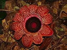 The visible body is globose. The flowers are about 20 cm across, dioecious and unisexual. They have 10 bracts and are bright red in colour covered with sulphur-yellow spots.[5] They appear above the ground, bloom for 2–3 days and have a putrid odour. Flowers are fleshy with imbricate inflorescence. Perianth is campanulate. Male flowers have 2-loculed anthers, broadly ellipsoid, dehiscent by apical pores; apical cupular body base convex; gynostegium blood red. The female flowers have a concave cupular body base with sterile stamens. Gynostegium stouter than stamens. Flowering and fruiting season occurs between December and February.[13] After blooming, the flower dehisces and becomes dark in colour and subsequently decomposes slowly. Fruits are swollen and crowned with perianth. The seeds are of the size of a grape fruit and are blackish-brown in colour.[5]