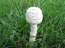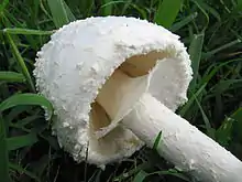 Saproamanita thiersii (formerly Amanita thiersii), commonly called Thiers' lepidella, is a North-American saprotrophic basidiomycete fungus in the genus Saproamanita. It is a white mushroom originally described from Texas but today found in nine states of North America. It was named after Harry Delbert Thiers. The cap of this small mushroom is white and convex, measuring 35–100 mm (1.4–3.9 in) and covered by volval remnants. It is sticky to the touch when wet. The gills are variable in length and number and are densely packed in some specimens and widely spaced in others. They are not attached to the stipe, which is 8–20 cm (3–8 in) long and about 1 cm (0.4 in) thick, with a white ring. The spores measure 7.8–9.8 by 7.3–9.0 µm and are roughly spherical in shape. The spore print is white.