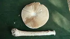 The gills are of varying lengths. They are free from the stipe and vary from crowded to widely spaced. They may be narrow or broad and are white to creamy yellow in color. The stipe is white and is 80–200 mm (3–8 in) long and 10–20 mm (0.4–0.8 in) wide. In some specimens, the stipe bruises to a yellow color. It is either hollow or lightly stuffed with a cottony tissue.[10] The bulb at the base is slightly broader than the rest of the stipe. The bulb is 25 mm (1.0 in) long and 22 mm (0.9 in) wide. A shaggy, drooping ring is present which is often shed before maturity.[6]