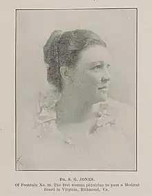 In 1888, she married Miles Berkley Jones, who, at that time, was also a teacher, and later, G. W. A. Secretary of the True Reformers.[3] From 1890 to 1893, Jones attended Howard University Medical College, sessions 23 to 25, and graduated as a medical doctor in 1893. She passed the Virginia State Medical Examining Board, receiving over 90 per cent on the examination in surgery.[3] Jones was the first woman to receive a certificate from the board. Thereafter, she practiced medicine in Richmond.[2] With her husband, who also became a physician, she opened Richmond Hospital, which was also known as the Women's Central Hospital.[4]