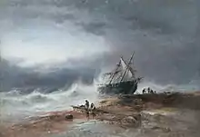 At this time she first travelled to the Channel Islands where she became a frequent visitor. She remained somewhat distrustful of people, which is reflected in the stormy nature of many of her paintings. In 1876, following the demise of her father, she gave up music and concentrated on art. She became a very successful artist with a particular focus on marine art, exhibiting 119 landscapes at the Society of Women Artists between 1867 and 1909,[6] and also at the British Institution.[7] In the early 1880s she was earning about £500 a year from painting. She died in 1909 of cancer.