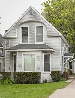 The Sarah Pennington House is a 1+1⁄2-story frame Queen Anne structure with a front roof gable. The gable end on the front facade has an elliptical arch seen in Colonial Revival and Shingle Style designs. Below the gable is a single story polygonal bay window with a hipped roof. The entrance is located on the side of building, through a projecting entrance bay. The house has one-over-one wood-framed window units capped with cornices.[2]