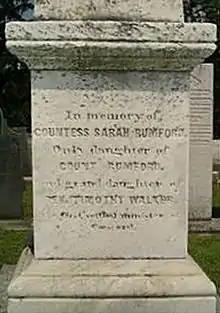 Around 1796, at her father's request, Sarah Thompson traveled to London to be with him, since four years earlier her mother had died.[3] In 1797, the Elector of Bavaria accepted Thompson as a Countess of the Holy Roman Empire.[3] In recognition of her father's military services to Bavaria, she was to be given one half of his pension of 2000 florins upon his death, with the right to live in any country she wished.[2][3] When her father died in 1814 she became "Countess Rumford".[2][3] Thompson spent her time between her homes in Brompton, London, and Concord, New Hampshire, with other trips in-between.[3] She often would travel to Paris and lived there for two and three years.[3]