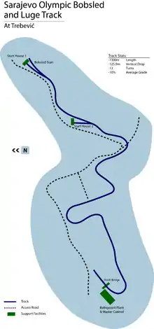 When Sarajevo was awarded the 1984 Winter Olympics in 1977, a bobsleigh and luge track was proposed. The track design was approved in 1981, with construction starting on 1 June of that year.[1] Assembly of the track was completed on 30 September 1982 at a cost of YUD 563,209,000. The first international competition of merit held at the track was the 1983 European Bobsleigh Championships in January of that year.[2] At the 1984 Games, there were 20,000 luge spectators and 30,000 bobsleigh spectators. After the Winter Olympics, the track was used for World Cup competitions[3] until the Yugoslav wars started in 1991, which included the Bosnian War the following year. The track was damaged as a result of the Siege of Sarajevo;[4] during the siege, the track was used as an artillery position by Bosnian Serb forces.[5] The track still remains mostly intact (as of January 2018), with the war wounds of defensive fighting holes drilled into one of the last turns of the course.[6] The track has been used for graffiti and bicycling in the period between the end of the war and the commencement of renovations in 2014. In June 2014, restoration began on the track, including the removal of overgrowth and graffiti, and the application of a protective coating from Start 1 down to the bottom of the course.[7] The track is currently used for summer luge training, and other summer activities.