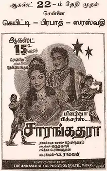 Sarangadhara is a 1958 Indian Tamil-language film directed by V. S. Raghavan and written by S. D. Sundharam. The film stars Sivaji Ganesan and P. Bhanumathi. Based on the epic of the same name by Gurajada Apparao, it has musical score by G. Ramanathan and was released on 15 August 1958.[1]