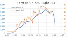 Several minutes after taking off from Moscow, the aircraft's speed and altitude started to fluctuate. Moments before the crash, Flight 703 had gained an altitude of 1,800 metres (5,900 ft) and an airspeed of 600 kilometres per hour (320 kn). It then lost altitude rapidly until it disappeared from the radar at an altitude of around 900 metres (3,000 ft).[3]