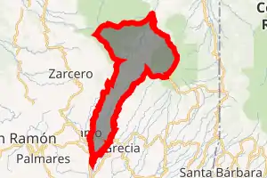 The elongated canton lies between the Molino and Toro rivers on the northwest and the Sarchí River on the southeast. It reaches northward into a beautiful high valley of the Cordillera Central (Central Mountain Range) between the Poás and Platanar volcanoes.