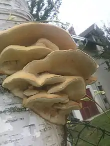 Sarcodontia crocea is a species of toothed crust fungus in the family Meruliaceae. The species was first described scientifically in 1822 by Lewis David de Schweinitz, who called it Sistotrema croceum.[2] It was transferred to the genus Sarcodontia by Czech mycologist František Kotlaba in 1953.[3] S. crocea usually occurs on old fruit trees, in which it causes a white rot. It is found in Europe, Asia, and North America. It is red-listed in several European countries.[4]