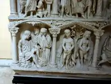 The scenes on the front are:[11] in the top row, Sacrifice of Isaac, Judgement or Arrest of Peter, Enthroned Christ with Peter and Paul (Traditio Legis), and a double scene of the Trial of Jesus before Pontius Pilate, who in the last niche is about to wash his hands. In the bottom row: Job on the dunghill, Adam and Eve, Christ's entry into Jerusalem, Daniel in the lion's den (heads restored), Arrest or leading to execution of Paul.