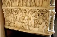 The sides have more traditional Roman scenes of the Four Seasons represented by putti performing seasonal tasks such as harvesting grapes. On a damaged plaque surmounting the lid is a poem praising Bassus in largely secular terms, and the inscription running along the top of the body of the sarcophagus identifies him, and describes him as a "neophyte", or recent convert. Further small reliefs on the lid, and heads at the corners, are badly damaged.[14] They showed scenes of feasts and a burial procession typical of pagan sarcophagi;[15] it is possible the lid was not created to match the base.