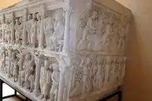The Sarcophagus of Junius Bassus is a marble Early Christian sarcophagus used for the burial of Junius Bassus, who died in 359. It has been described as "probably the single most famous piece of early Christian relief sculpture."[1] The sarcophagus was originally placed in or under Old St. Peter's Basilica, was rediscovered in 1597,[2] and is now below the modern basilica in the Museo Storico del Tesoro della Basilica di San Pietro (Museum of Saint Peter's Basilica) in the Vatican. The base is approximately 4 x 8 x 4 feet.