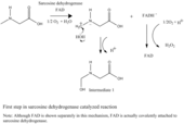 the first step of the reaction might involve the transfer of a hydride on the N-methyl group of sarcosine onto FAD, allowing H2O to attack the carbocation in order to form intermediate 1 (See figure 1). There is no deamination step. Instead, the demethylation of the N-methyl group on sarcosine occurs directly.[6] The reduced FADH− from the first step then is oxidized by O2 to form H2O2.[5]