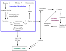 Sarcosine dehydrogenase is one of the enzymes in sarcosine metabolism, which catalyzes the demethylation of sarcosine to make glycine. It is preceded by dimethylglycine dehydrogenase which turns dimethylglycine into sarcosine. Glycine can also be turned into sarcosine by glycine N-methyltransferase.[13] Since glycine is the production of sarcosine dehydrogenase catalyzed reaction, aside from sarcosine metabolism, the enzyme is also indirectly connected to the creatine cycle and the respiratory chain in the mitochondria [14][15][16] (See figure 4 for pathway). Even so, the biological significance of sarcosine dehydrogenase beyond sarcosine metabolism is not entirely known. In a study of hereditary hemochromatosis using both wild type and HFE (gene) deficient mice fed with 2 percent carbonyl iron supplemented diet, sarcosine dehydrogenase was shown to be down-regulated in HFE deficient mice, but role sarcosine dehydrogenase in iron metabolism is unknown from the experiment conducted.[17]