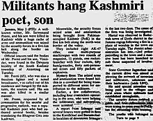 Sarwanand Koul Premi, also spelled Sarvanand Kaul Premi (2 November 1924 – 1 May 1990), was a famous Kashmiri poet, journalist, research scholar, Gandhian, social reformer and independence activist living in Jammu & Kashmir, India. He along with his young married son, Verinder (27) was kidnapped and executed by Islamic terrorists in 1990.[1][2][3][4][5][6]