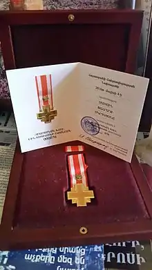 Sassun Mkrtchyan was posthumously awarded the Republic of Armenia medal "For Military Services" by order No 32-Ա issued in 2016 by the President of Nagorno-Karabakh.[10] On May 4, 2016 Sassun Mkrtchyan was posthumously awarded the Order of Military Cross, 1st degree by the decision of the president of the Republic of Armenia.[11] During peacetime Sassun was awarded with merit certificates "Best soldier-serviceman" and "For high merits in the field of military readiness".
