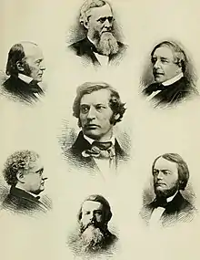 The original members of the group included Woodman, Louis Agassiz, Richard Henry Dana Jr., Judge Ebenezer Rockwood Hoar, Senator George Frisbee Hoar, and James Russell Lowell.[2] In the following years, membership was extended to Holmes, Cornelius Conway Felton, Henry Wadsworth Longfellow, and William Hickling Prescott.[6] Other members included Ralph Waldo Emerson, Asa Gray, John Lothrop Motley, Benjamin Peirce, Charles Sumner, John Greenleaf Whittier, and others. Invitations to the group were considered a sort of affirmation of acceptance into Boston's high society. Ohio-native William Dean Howells was invited by James Russell Lowell in 1860 and recalled in a memoir that it seemed like a rite of passage. Holmes joked that Howells's presence serve as "something like the apostolic succession... the laying on of hands". A few years later, Howells was named editor of the Atlantic Monthly, which published many of the works by members of the group.[7]