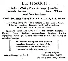 Law was born to Ambikacharan Laha and Kiranbala Devi at their home on Kailash Bose Street in Calcutta. He was educated at Metropolitan College, and at Presidency College, obtaining a master's degree in history.[2] He then obtained a law degree. He had an interest in bird from an early age and began to keep them and observe them in captivity. He was for a while a treasurer of the Indian Statistical Institute. He established an aviary at this home in Agarpada, near Calcutta in 1926. He was elected Fellow of the Zoological Society of London and Member of the British Ornithologists' Union. In 1937, Nirad C. Chaudhuri became his literary assistant.[1] He wrote books on a variety of topics including birds (Pet Birds of Bengal 1923) based on his experience in keeping aviaries. He was a vice president of the Calcutta Zoological Garden for a while. He founded, in 1924, a journal, Prakriti, in Bengali for the popularization of natural science.[3][4][5]