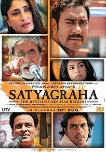 Satyagraha is a 2013 Indian Hindi-language political drama film directed by Prakash Jha starring Amitabh Bachchan, Ajay Devgn, Kareena Kapoor, Arjun Rampal, Amrita Rao, Manoj Bajpayee, and Vipin Sharma in the lead roles.[6][7][8] The first look of the film was released on 10 September 2012.[9][10] Satyagraha was released on 30 August 2013, although it released in the UAE one day before on 29 August.[2][11] The teaser was released online on 30 May 2013 and theatrically attached with Yeh Jawaani Hai Deewani.[12][13][14][15]