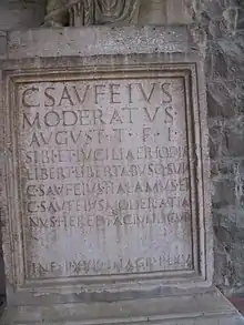The gens Saufeia was a minor plebeian family at ancient Rome. Members of this gens are first mentioned in the final century of the Republic, and from then to the early Empire their name occurs regularly in history, but none of them ever attained the consulship.[2]