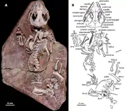 {{cite journal}}: CS1 maint: uses authors parameter (link) - Sean P. Modesto, Hans-Dieter Sues and Ross J. Damiani (2001). "A new Triassic procolophonoid reptile and its implications for procolophonoid survivorship during the Permo-Triassic extinction event". Proceedings of the Royal Society B: Biological Sciences. 268 (1480): 2047–2052. doi:10.1098/rspb.2001.1766. PMC 1088847. PMID 11571052.