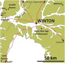 The Belmont sheep station is part of the fossil-bearing rock units in the upper Winton Formation, which has been dated to around or just after the boundary between the Cenomanian and Turonian epochs of the Cretaceous—about 93.9 million years ago—based on uranium-lead dating of detritial zircons.[26] It is the geologically youngest rock unit of the Mesozoic era in the Eromanga Basin. Six major facies, or distinct rock types, are found in the Winton Formation: two different types of sandstone-siltstone combinations (associated with meandering rivers, crevasse splays, and levees), mudstones (associated with oxbow lakes and ponds), sandy siltstones to silty mudstones (associated with tidal flats), plant-rich mudstone and coal (associated with swampy ground), intraformational conglomerates (associated with flooding). These rocks suggest that Savannasaurus lived on a freshwater floodplain covered in broad, meandering river channels with low-energy waterflow, which was subject to occasional flooding.[27][28]