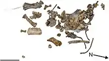 The bones were preserved over an area of less than 20 m2 (220 sq ft). While the dorsal vertebrae were not articulated, they were preserved in sequence in front of the hip bones, allowing for their identification. The ribs on the left side appear to have been crushed prior to fossilization, before all of them were fragmented further. The fifth dorsal vertebra and both humeri show signs of being trampled by other dinosaurs before fossilization, which may also explain the scattered bones; however, the bones were less scattered than other dinosaur specimens from contemporary rocks. A third excavation in September 2006 discovered no additional remains, but a partial centrum from a caudal vertebra was found on the surface in 2013.[3]