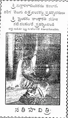 Savitri (English: Goddess Saraswati) is a 1933 Indian Telugu language drama film directed by C. Pullaiah. It was based on a popular stage play of Mylavaram Bala Bharati Samajam. It was the first film produced by East India Film Company with an estimated budget of ₹75,000 in Calcutta.[1] The blockbuster film has received an honorary diploma at the 2nd Venice International Film Festival.[2] The story is about Savitri and Satyavan from Mahabharata. According to the legend, Princess Savitri (Dasari Ramathilakam) marries Prince Satyavan despite a curse that foretells his death within a year. She manages to get Yama (Vemuri Gaggaiah), the god of death, to restore her husband to life.[3]