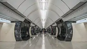 Construction on the station began in 2012.[6] At first, the city intended to use typical underground tunneling methods for the station, which is 65 meters underground. Project engineers suggested a new technology that would involve a single-vaulted design that is more commonly used for shallow stations constructed using cut-and-cover methods. This could reduce the construction time from 36 to 24 months.[7] The city originally expected the station to be ready by 2016.[8] This later was pushed to 2017 and, eventually, the beginning of 2019.[9][10] Because of the time and difficulty of building such deep stations, the Head of Construction for Moscow Marat Khusnullin said that this would be the last deep station built in Moscow.[11]