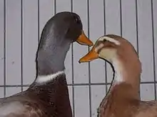 The Saxony has only one colour variety, buff-blue mallard:[lower-alpha 1] the drake has a greyish-blue head, white neck-ring, and rust- or chestnut-coloured breast feathers; the duck is a rich, light buff colour with two white stripes on each side of the face, one over the eye and the other from the eye towards the beak.[10] Both drakes and ducks have a yellowish bill and orange legs and feet, although the standard specifies dark yellow.[6]: 5