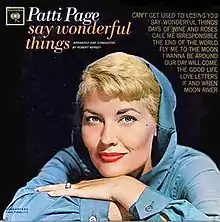 Say Wonderful Things was a 1963 LP album by Patti Page, released by Columbia Records as catalog numbers CL 2049 (monaural) and CS 8849 (stereo). The album was Page's first LP for Columbia after her long and successful tenure on Mercury Records. The title song only reached #81 on the Billboard Hot 100, but was more successful in international markets such as Australia, Hong Kong and Japan. The album reached a peak of #83 on the Billboard Pop Albums chart.