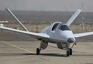 The prototype has stealth aircraft characteristics and shaping.[2] Air intake is aft of cockpit, two narrow S-duct inlets preventing radar waves from reaching the engine fan blades. V-tail configuration is like that of the YF-23 (Northrop Grumman is the parent company of Scaled Composites). The prototype has similar configuration to the General Atomics Avenger.[3][4]