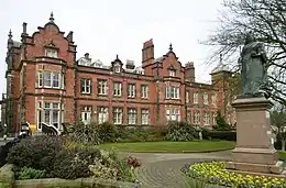 Scarborough Town Hall, originally St Nicholas House, is a red brick Jacobean Revival mansion in Scarborough, North Yorkshire, England, currently used as a municipal building for the Borough of Scarborough and an events venue. It was built in the 19th century as a home for John Woodall, a prominent local businessman, and then converted and extended for municipal use in 1903. Situated overlooking the South Bay, it is a grade II listed building.[3]