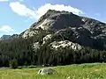 The peak is situated in the remote Wind River Range, three miles west of the Continental Divide, and approximately four miles south of the Cirque of the Towers. It is set in the Bridger Wilderness, on land managed by Bridger-Teton National Forest. Topographic relief is significant as the northeast aspect rises 2,000 feet (610 meters) in one-half mile. Nearby geographic features include Haystack Mountain, 1.9 mile to the east, Big Sandy Lake one mile north, and Temple Peak 2.3 miles to the southeast. Access to the mountain is via the Big Sandy Trail. Molybdenum was discovered on the mountain around 1940, and several claims were staked, but little ore was extracted.[6][7] Precipitation runoff from the mountain drains into headwaters of the Big Sandy River, which is a tributary of the Green River.