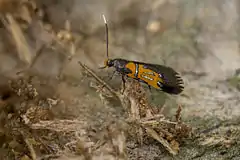 The wingspan is about 15 mm. The moth flies from May to June depending on the location.[1]