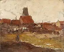 One of the first cityscapes painted by Piet Mondrian is the work from ca. 1895 entitled "View of Schinkelbuurt" (Gezicht op Schinkelbuurt). The painting shows part of the district bathed in sunlight. This neighborhood, inhabited from the Middle Ages at the end of the Overtoomse canal, belonged to the edges of the city in Mondrian's time. Mondrian based his landscapes and cityscapes on direct observation.