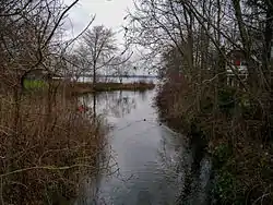 The first part of the rivers is within the village of Bünsdorf and contains several bridges. The next part passes through agricultural areas, while the second half is mostly flowing through unpopulated and hardly accessible wet areas, mostly on the western bank of the river. The final part near the farm Gut Schrinau is held back by a dam to form a small lake. Prior to the construction of the Kiel Canal it discharged into the river Eider below Gut Schrinau; nowadays it there discharges into the Kiel Canal.