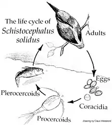 It parasitizes fish and fish-eating water birds. The fish-eating water bird is the definitive host, and reproduction occurs in the bird's intestine. Eggs of the tapeworm are passed with the bird's feces and hatch in the water, where the first larval stage, the coracidium, is produced. The coracidium is then ingested by the first intermediate host, a cyclopoid copepod (e.g. Macrocyclops albidus). The second larval stage then subsequently develops in the tissue of this host. Within one to two weeks, the infected copepod is ingested by the second intermediate host, the three-spined stickleback, Gasterosteus aculeatus. The third larval stage, the plerocercoid, grows in the abdomen of the fish. When the fish is eaten by a bird, the larvae mature and adults start to produce eggs within two days. Reproduction takes place within one to two weeks, after which the parasite dies.[4]
