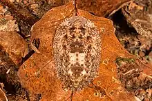 The upper side of the body (pronotum, mesothorax and metathorax and abdomen) of the nymphs is covered with tubercles, giving it a rough appearance. In adults, the pronotum is smooth and shining and the lateral posterior edges of the pronotum are bifurcated, resulting in two lobes.[3]