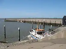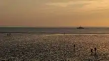 The national park has 70 neighbouring communities in Schleswig-Holstein with 290.000 people living there. Additionally approximately 15 Million people visit the national park every year.[43] The area of the Wadden Sea National Park is harnessed by tourism, fishery, oil production, coastal defence, grazing, maritime traffic and air traffic, withdrawal of gravel and sand, mussel cultivation and sometimes used for military weapon testing. Most of the utilisation is located directly near or at the coast, so the seaward area is more or less unaffected by human influences.[3] Since the amendment of the second national park law in 1999 mainly voluntary agreements coordinate the limitation in human utilisation of the Wadden Sea. The consideration of traditional usages highly increased the approval of the national park by locals.[44] Since 1987 utilisations, which hardly affect the ecosystem Wadden Sea at all, are allowed again by law. Such utilisations are e.g. collecting small amounts of plants for science or education.[13]