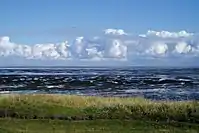 Over 2/3 of the national park are covered with water permanently (sublittoral), 30% of mudflat that is lying dry during low tide and gets flooded with water during high tide (eulittoral).[12] The rest is land area that only gets flooded under certain conditions (supralittoral). The water areas contain the offshore part of the park as well as huge tidal currents like the Lister Tief, the Heverstrom, the Purrenstrom, the Wesselburener Loch or the Piep. Outside the mudflat area runs a constantly strong current from south to north, coming from the southern North Sea and going on to the Norwegian Trench. Owing to the river mouths of several big European waters (like the Rhine or Elbe), the current´s salinity of 20–30 psu lies below that of the ocean, and above that of the river mouths.[6]