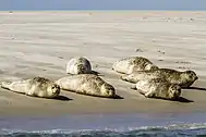 A great number of harbour porpoises live in the national park.[15] The Wadden Sea is also home to harbour seals and grey seals. According to the official counting of the National park Administration, about 13.000 harbour seals are living in the Wadden Sea of Schleswig-Holstein (2017). Nearly half of the seal population died during the "Seehundstaupe" epidemic in 1988 and 2002.[17] The National Park Administration assumed that one third of the harbour seal population was swimming or hunting during the counting so the number had to be adjusted.[18] The grey seal population consists of 140 animals and is mainly located on the "Jungnamensand" sand bar and the "Knobsand" sand bars near the island Amrum.[19]